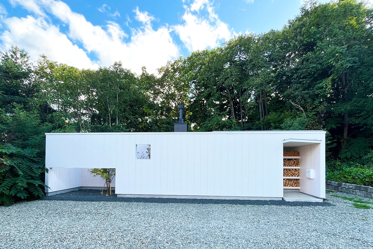 片流れを組み合わせた形状の面白さがあり、住宅本体はブラックの金属サイディングで、それと対比するようにホワイトとしたことで、一層引き立っています。