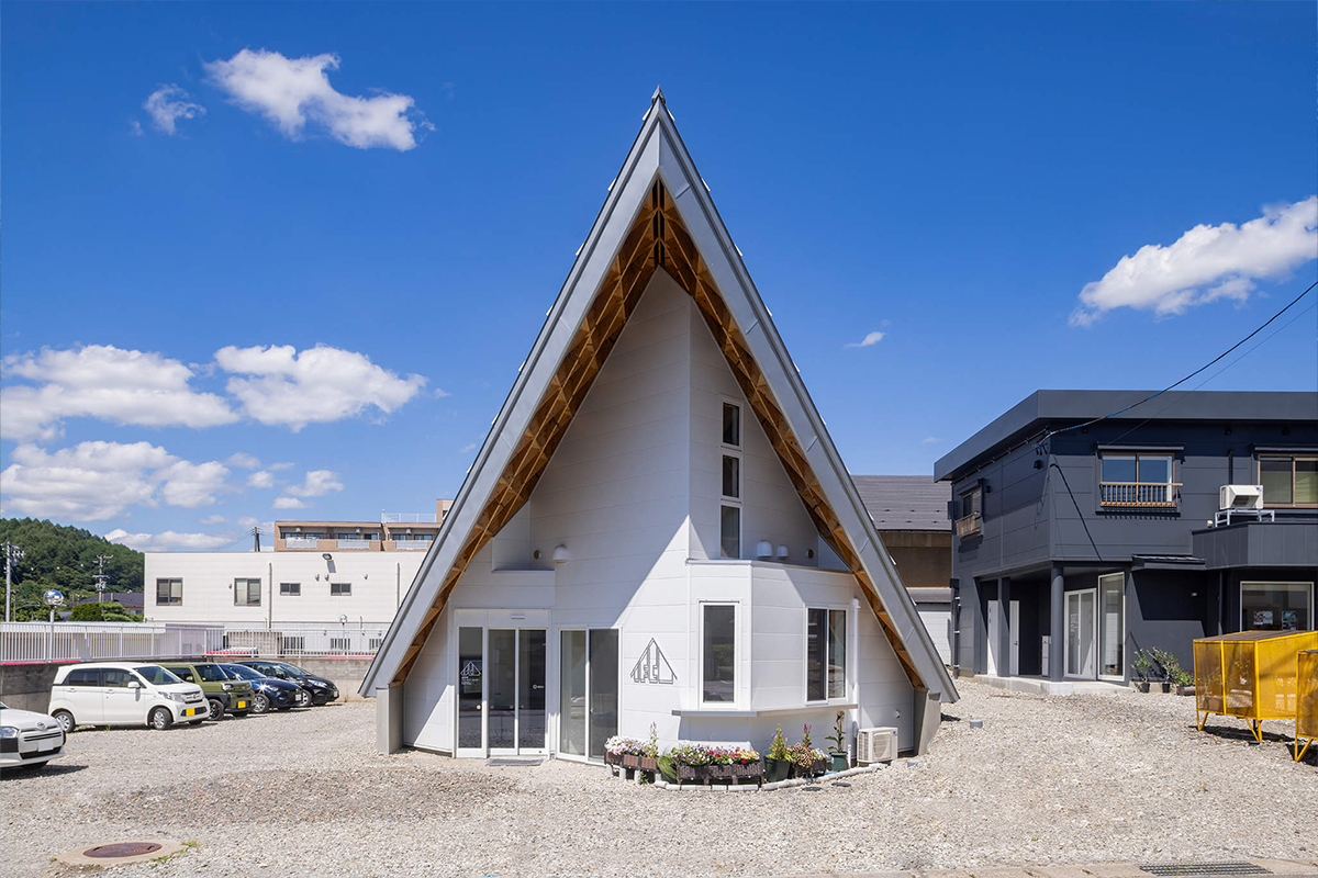 特に片流れ屋根と斜め窓による平行線の構成、ならびに白いゲートの角度および配置には高度な意匠性が認められます。