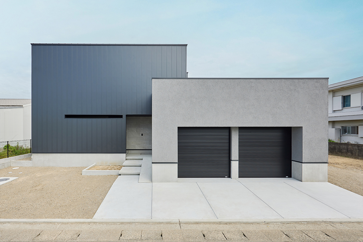 また、植栽計画やカーポートのレイアウトにおいてもバランスが重視されており、金属サイディングによる直線的な外観が住宅・庭・街区を結ぶランドマーク的役割を果たしています。