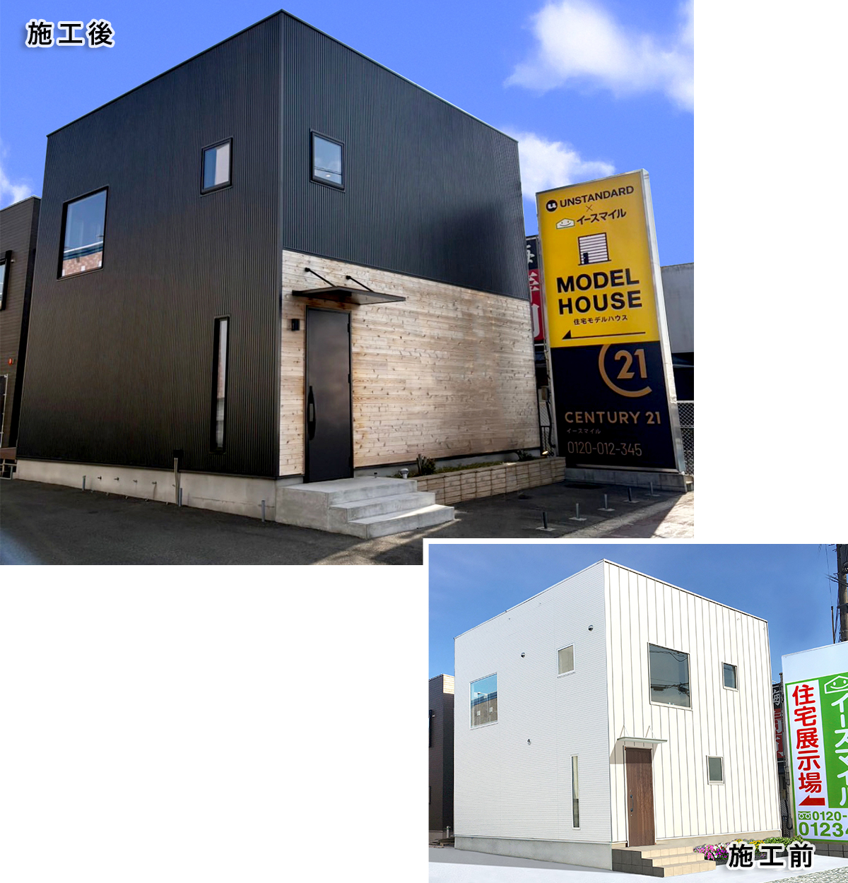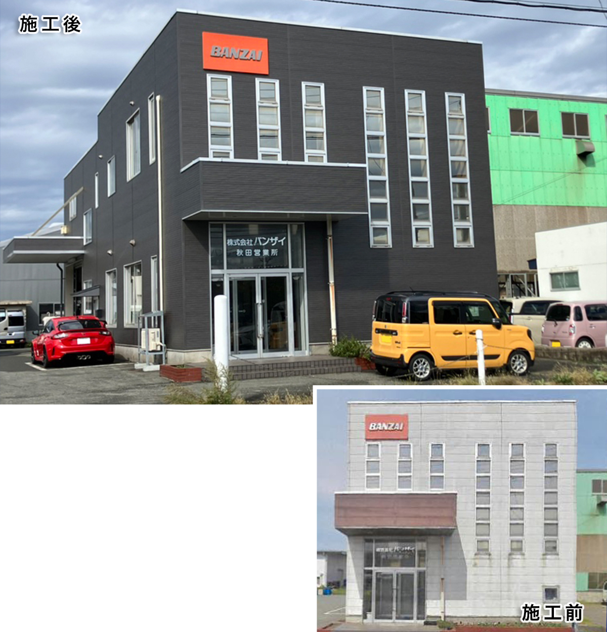 リフォーム前は、野暮ったい(と言ってはなんですが…)建物でしたが、リフォーム後は、見ていただくとおり、ブラック系とホワイト系の金属サイディングを交互に張って、箱を重ねたような、お洒落なファサードになりました。角地に建つことから、町の目印になるような建物に生まれ変わりましたね。